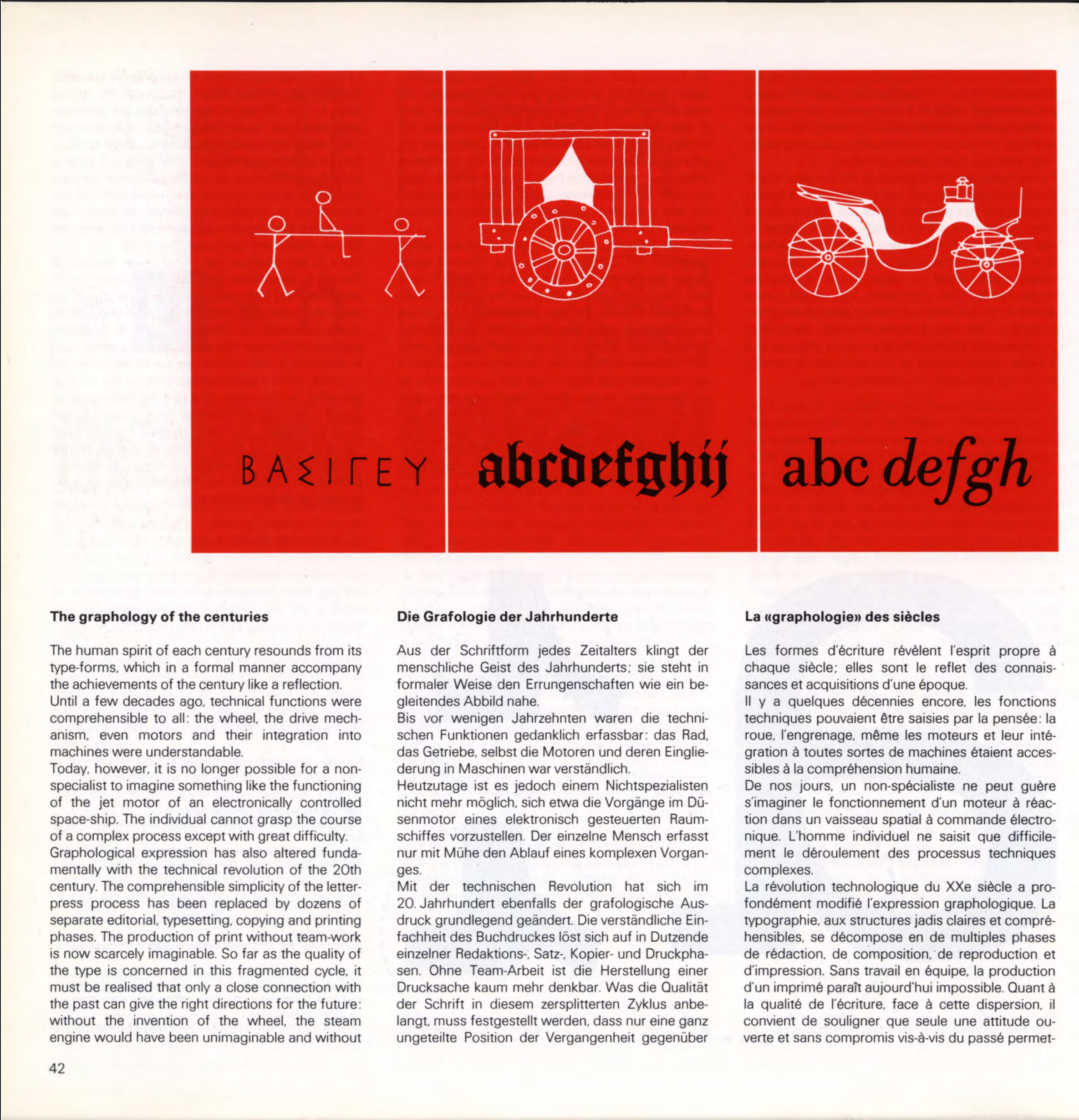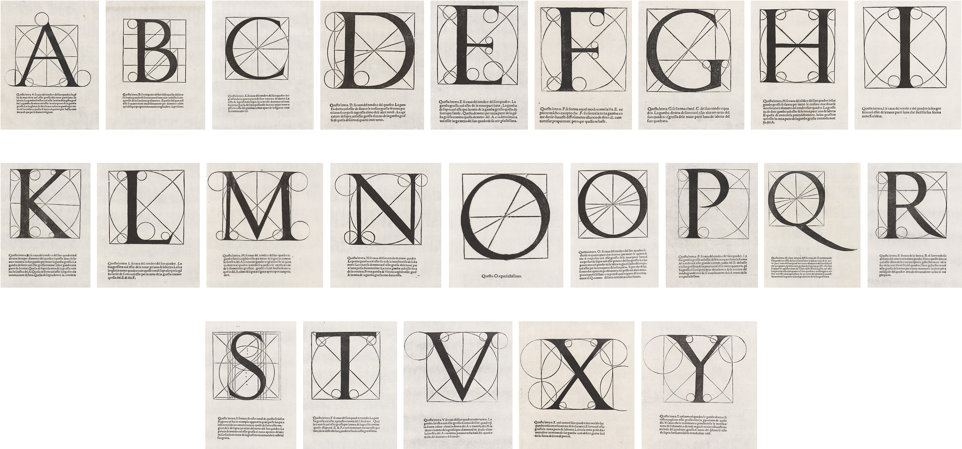 Les traités de Pacioli, Dürer, Tory, diffèrent bien moins par les proportions qu’ils proposent que par les attitudes qu’ils trahissent. Dürer est plus artiste, plus tolérant, moins doctrinaire; Pacioli est un rationnaliste; Tory, lui, est franchement un mystagogue. En fait, à la seule exeption de Griffo, le graveur d’Alde Manuce, aucun caractère typographique de la Renaissance ne semble s’être directement inspiré des modèles classiques ni de leur théoriciens. Et, bien que les fondeurs et graveurs des XVIe et XVIIe siècles eurent tendance à s’en rapprocher, dans la mesure typographiquement sinon géométriquement possible, il reste qu’en définitive ces modèles attirent davantage, et pour des raisons évidentes, les architectes et les sculpteurs. Pour eux, l’alphabet de Pacioli est encore le meilleur guide et le plus pratique.